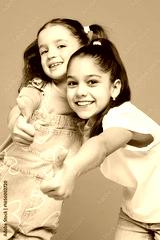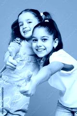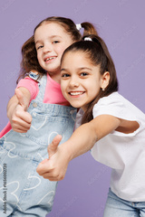 Little smiling fun two friends kids children girls 9-10 years old wear casual clothes together hug cuddle show thumb up like gesture look camera isolated on plain purple background. Lifestyle concept.