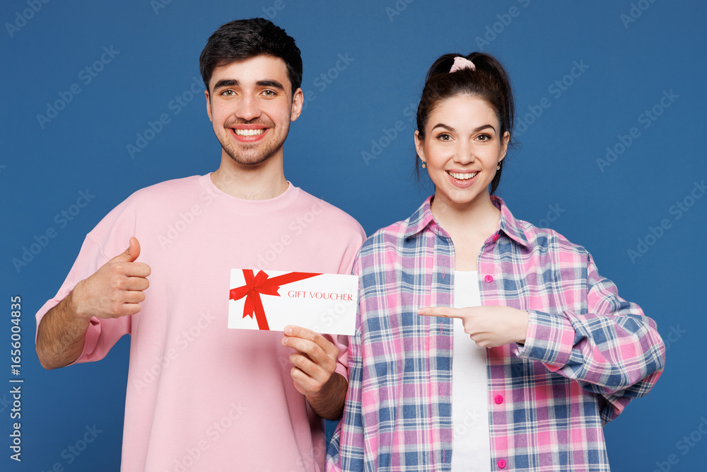 Young couple two friends family man woman they wear pink casual clothes together hold gift certificate coupon voucher card for store show thumb up isolated on plain blue background. Lifestyle concept.