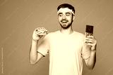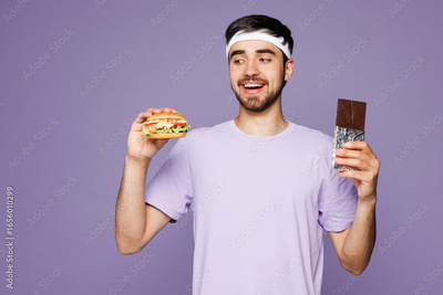 Young strong fitness trainer instructor sporty man sportsman wear headband t-shirt training in home gym eat burger and chocolate bar isolated on plain purple background. Workout sport fit abs concept.
