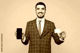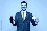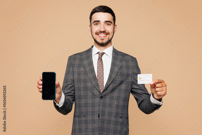 Young happy employee business man corporate lawyer wear grey suit shirt tie work in office hold blank screen area mobile cell phone credit bank card order delivery isolated on plain beige background.