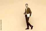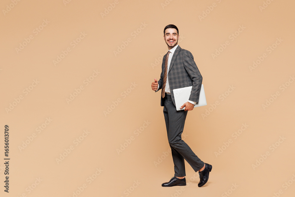 Full body young successful employee IT business man corporate lawyer wears classic grey suit shirt tie work in office hold laptop pc computer show thumb up isolated on plain beige background studio.