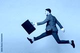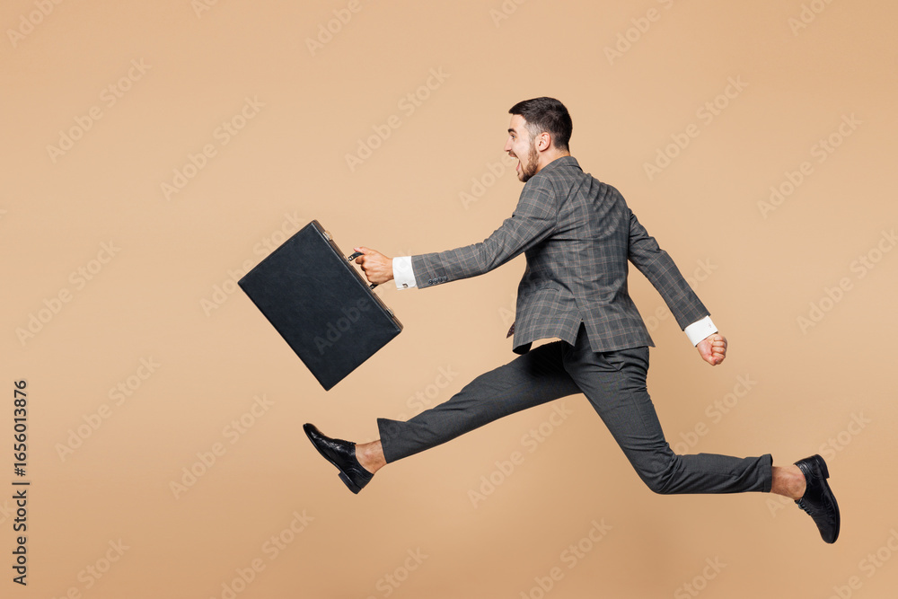 Full body side view young employee business man corporate lawyer he wear classic formal grey suit shirt tie work in office hold black briefcase jump high run isolated on plain beige background studio.