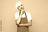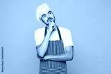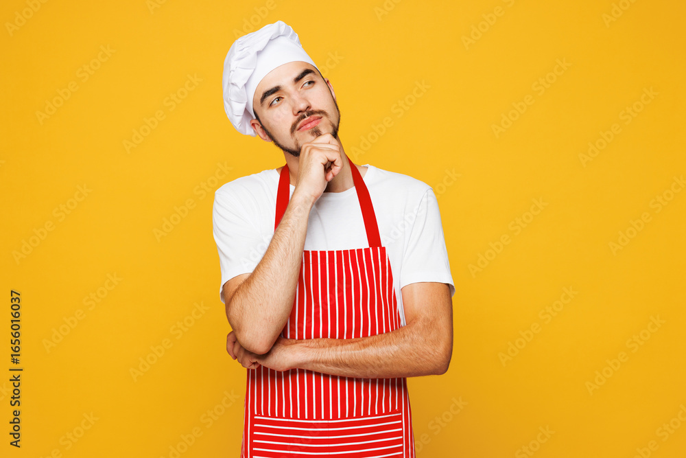 Young housewife housekeeper chef cook baker man wear red apron toque hat put hand prop up chin, lost in thought and conjectures isolated on plain yellow orange background studio. Cooking food concept.
