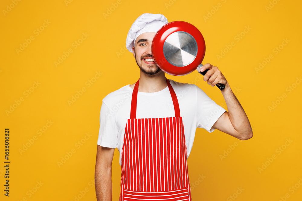 Young happy housewife housekeeper chef cook baker man wear red apron toque hat hold in hand cover eye with frying pan isolated on plain yellow orange background studio portrait. Cooking food concept.