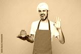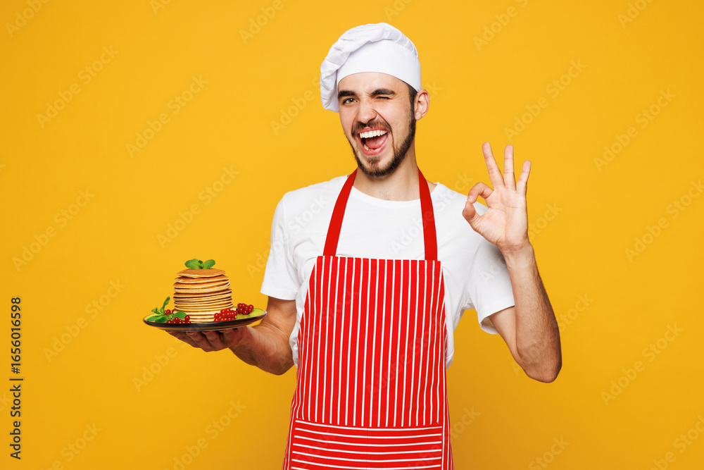 Young housewife housekeeper chef cook baker man wears red apron toque hat hold stack of fluffy pancakes on plate show ok okay isolated on plain yellow orange background studio. Cooking food concept.