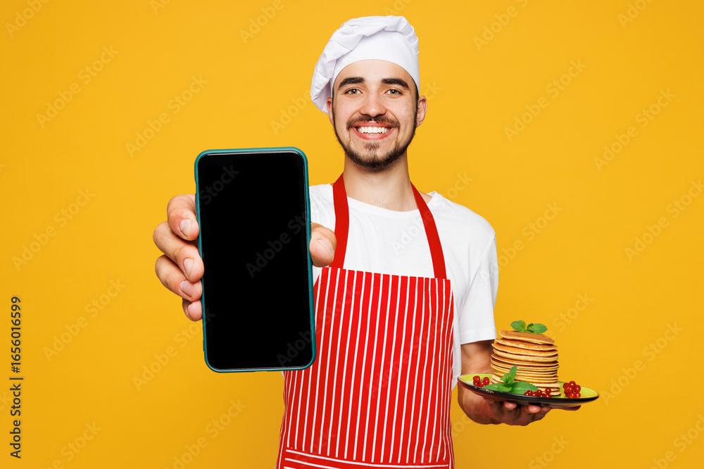 Young housewife housekeeper chef cook baker man in red apron toque hat hold pancakes use blank screen mobile cell phone isolated on plain yellow orange background studio portrait Cooking food concept