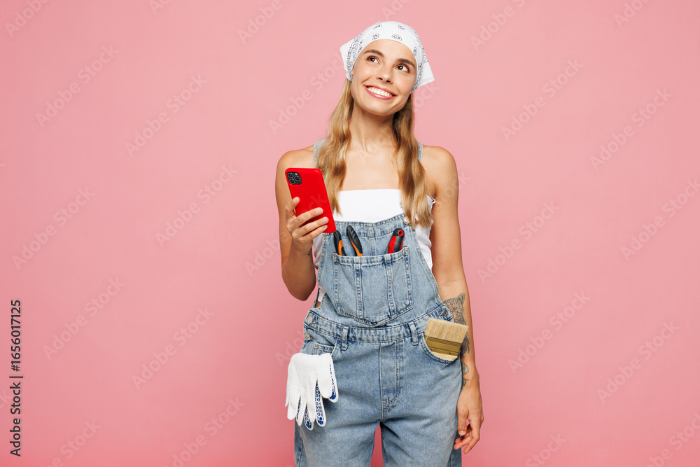 Young minded employee laborer handyman woman wear denim overhaul hold in hand use mobile cell phone isolated on plain pink background. Instruments for renovation apartment room. Repair home concept.