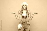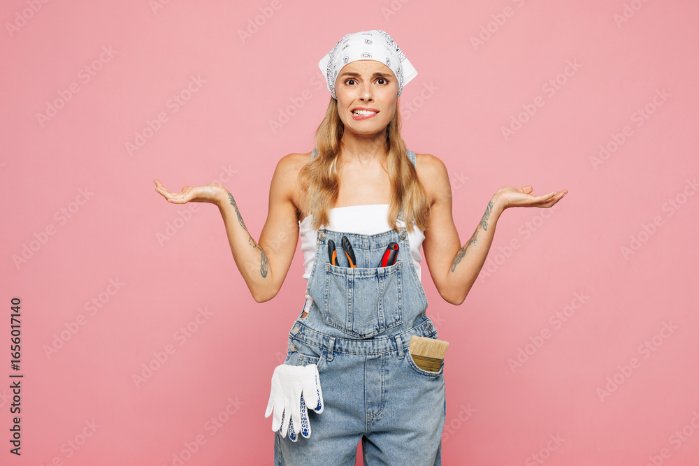 Young shocked confused sad employee laborer handyman woman wear denim overhaul spread hands say oops isolated on plain pink background. Instruments for renovation apartment room. Repair home concept.