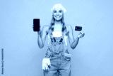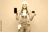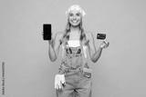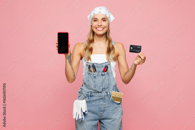 Young laborer handyman woman wear denim overhaul hold credit card use blank screen mobile cell phone isolated on plain pink background. Instruments for renovation apartment room. Repair home concept.