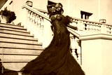 Elegant woman in luxurious red couture gown with feather details posing on stairs outdoors, glamorous fashion photoshoot in evening dress on summer day
