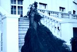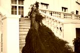 Elegant woman in luxurious red couture gown with feather details posing on stairs outdoors, glamorous fashion photoshoot in evening dress on summer day