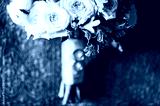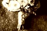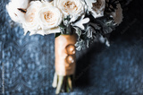 Couple close-up of engagement gold wedding rings on the background of an elegant bouquet of flowers