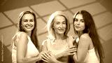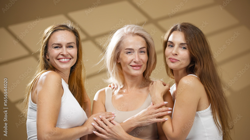 Three women with diverse hair colors and styles, wearing light tank tops, are smiling and embracing in a wellness spa setting, showcasing beauty, friendship, and self-care in a serene atmosphere