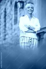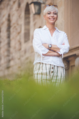 European happy blond adult woman looking to camera. Smiling face of beautiful mid aged female person dressed in white summer shirt. Outdoors