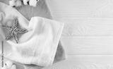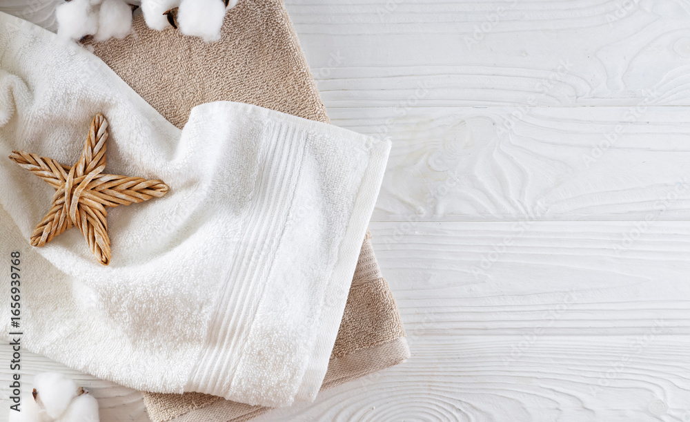 Terry towel top view, bath item promotional display. Spa and hygiene background,top view backdrop.Showcase.