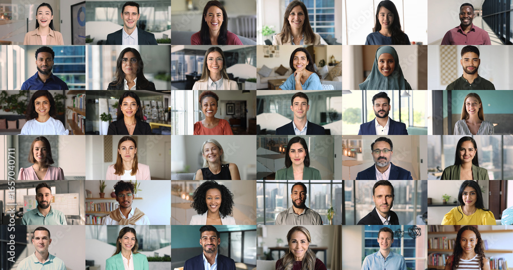 Collage of faces shown in multiple grids, group of men and women representing diversity, inclusion, global connectivity. Collaboration across cultures and industries. Professionalism, communication