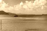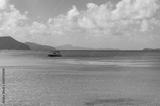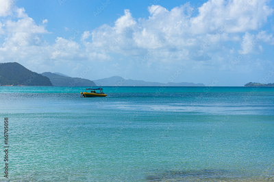 Beautiful tropical sea bay, lagoon with boat and mountains in the distance