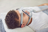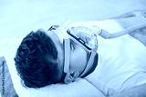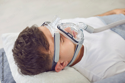 Man lying on the couch at home, breathing through an oxygen mask. He is dealing with asthma, apnea or another disease, receiving medical care and healthcare treatment in comfortable home environment.