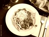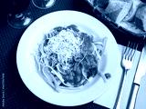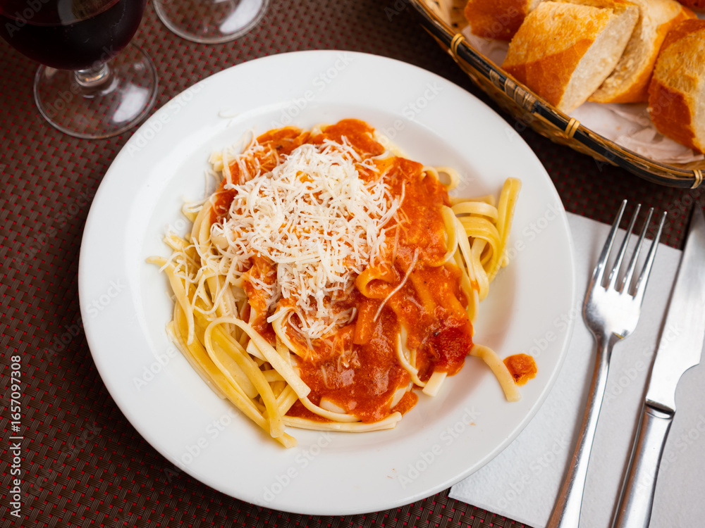 There is plate with Bolognese pasta. Boiled noodles, supplemented with tomato and meat gravy and grated cheese. If desired, you can eat food with piece of bran bread served in separate bowl
