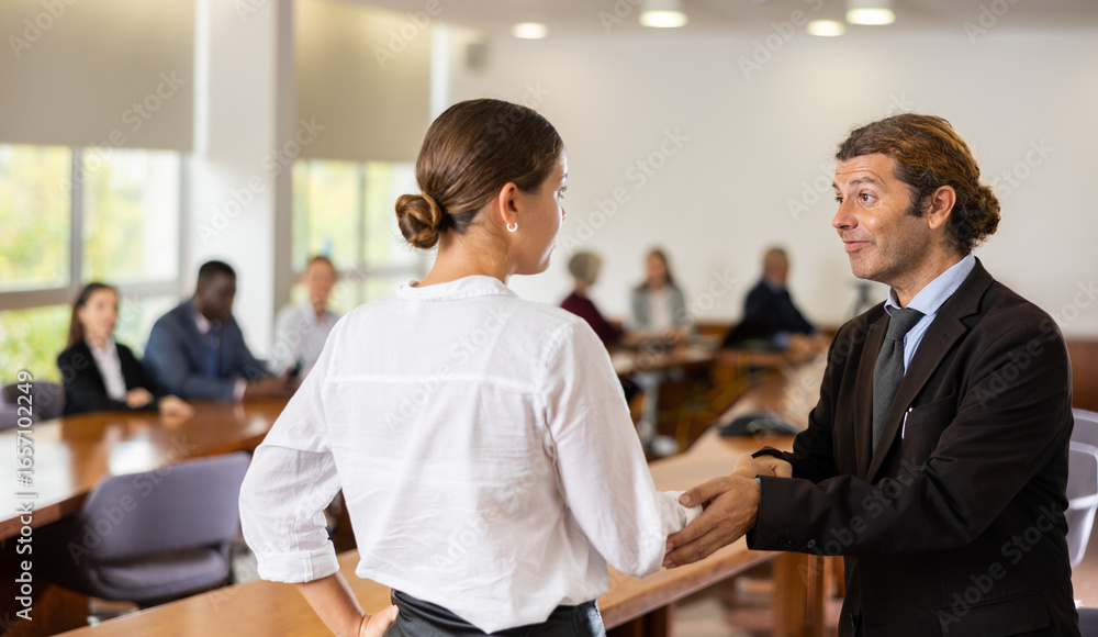Rident mid aged white executive director having friendly handshake with a happy new white female employee congratulating her on getting new job in international company in front of other employees