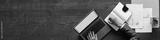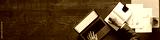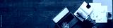 Top view showing Caucasian middle aged man working on laptop while writing in notebook, analyzing printed business charts and graphs, smartphone and eyeglasses placed nearby on wooden desk