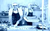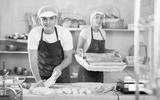 Skilled young baker in burgundy apron kneading dough on flour-dusted wooden table in inviting setting of small artisan bakery, highlighting craftsmanship of traditional breadmaking..