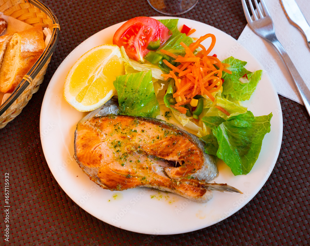 Appetizing baked salmon with fresh salad and vegetables served on platter