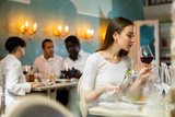 Positive young woman eating salad and drinking red wine in a cozy restaurant