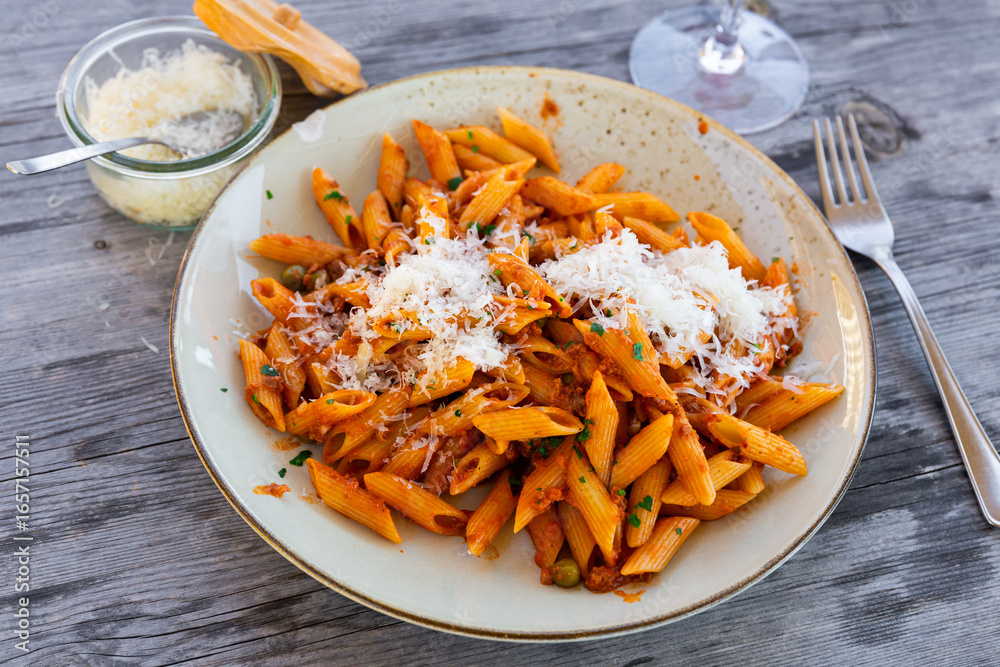 Italian pasta pene rigate with minced meat and herbs in tomato sauce served on platter