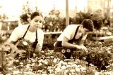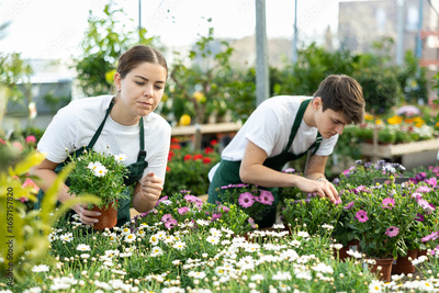Two professional gardeners in aprons working with blooming Osteospermum Ecklonis and Argyranthemum Frutescens flowers in pots