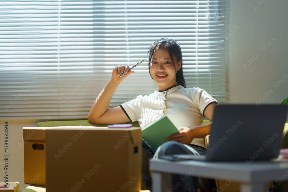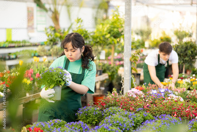 Focused young Asian female florist working in greenhouse, engaged in growing of potted garden plants inspecting blooming Lobelia erinus with blue flowers..
