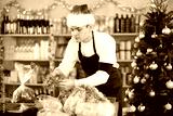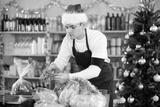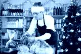 European guy stand at sales area, ready to communicate with customers. He in apron prepares working trading floor, decorates it with tinsel and prepares to celebrate new year at work in minimarket