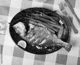 Delicious dorada fish served with baked potatoes and asparagus on plate..