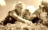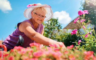 Senior woman working in her garden with a plants. Hobbies and leisure