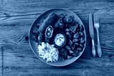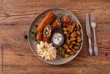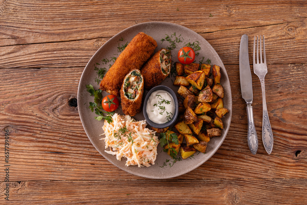 Pork chop rolls stuffed with spinach and mozzarella. Served with sun-dried tomatoes and roasted potatoes.