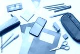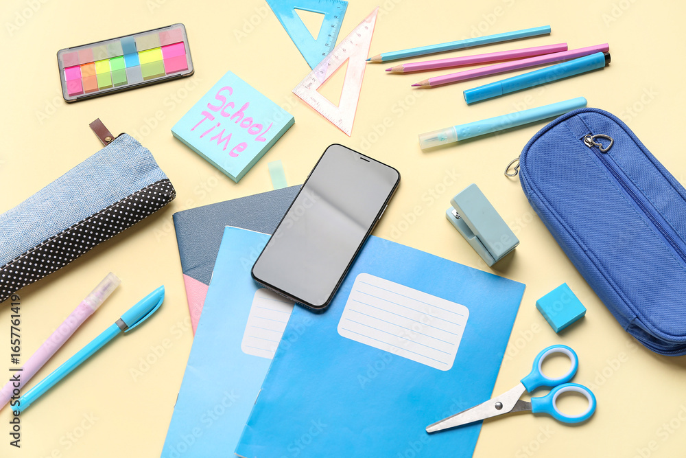 Sticky note with text SCHOOL TIME, different stationery and mobile phone on yellow background