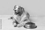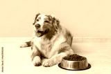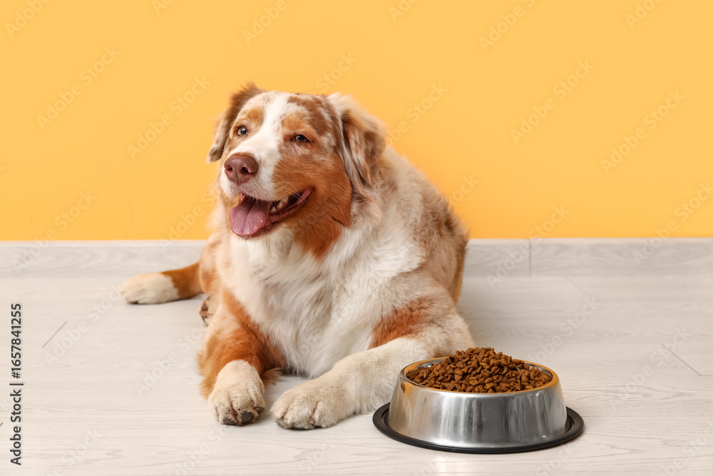 Cute Australian Shepherd dog lying with bowl of dry food near orange wall