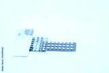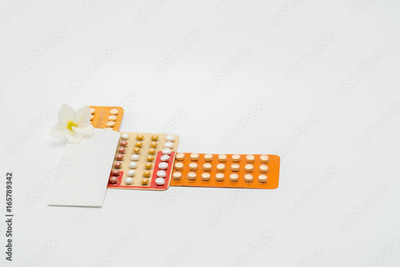 Pile of birth control pills with flower on white background