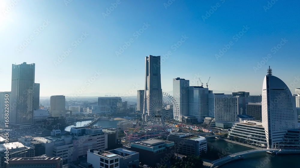 都市、空撮、ドローン、都会、町並み、街、港湾、湾岸、展望、海洋、社会、青空、コピースペース、俯瞰、パノラマ、ハイアングル、風景、鳥瞰図、景観、景色、上から見た、見下ろす、現代、日本、観光、旅行、行政、公共、建設、建築、ビル、ビル群、開発、河口、船舶、公園、建物、自然、飛行、眺望、背景、ビジネス、晴れ、地平線、施設、産業、交通、インフラ、マンション