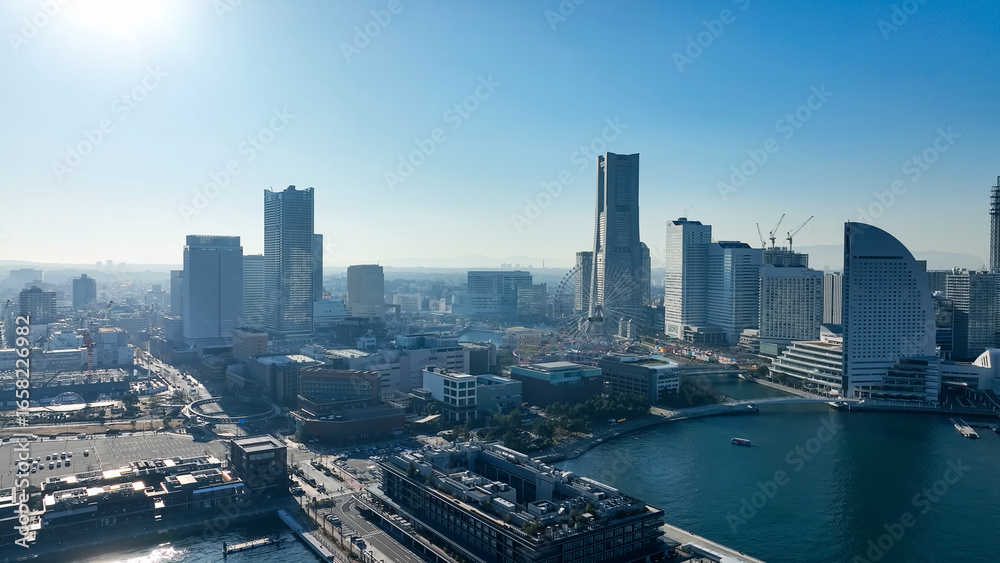 city, society, aerial view, drone, skyscraper, tourism, travel, trip, journey, blue sky, sun, construction, business, hotel, perspective, urban, japan, ocean, reclaimed land, pier, building, group of