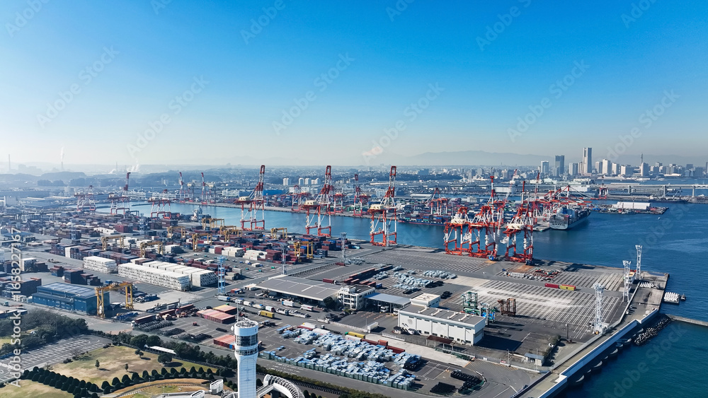 Drone aerial view of a port city