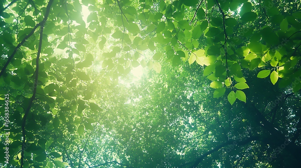 Sunlight through the trees canopy nature background forest foliage green leaves idyllic peaceful serene landscape
