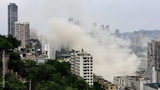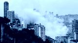 Misty fog burst through Chongqing city skyline creating dramatic urban landscape memories in China station district
