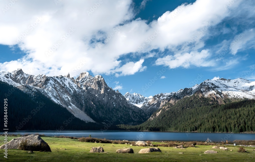 Majestic Mountain Lake Landscape with Snow Peaks and Green Meadow - Alpine Wilderness Adventure and Nature Travel Destination