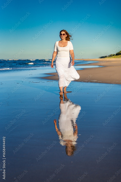 Beautiful mature woman walking on seashore on sandy beach in summer. Front view