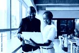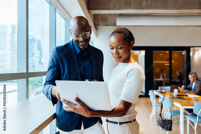 Two colleagues discussing a project and viewing a laptop in an office setting