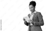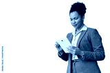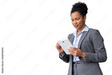 Confident businesswoman using digital tablet, navigating online resources, managing business projects, transparent background