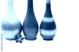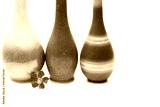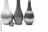 Modern pottery vases with beautiful patterns, pink flower in front of vases isolated on white background