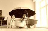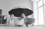Young stressed couple sits at table under open umbrella, collecting water drips in buckets, experiencing household issue, roof leaks or plumbing problems, calling to home repair services