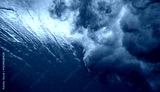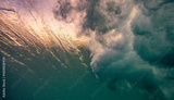 Underwater view of water surface below surfing wave breaking in bubbles and foam